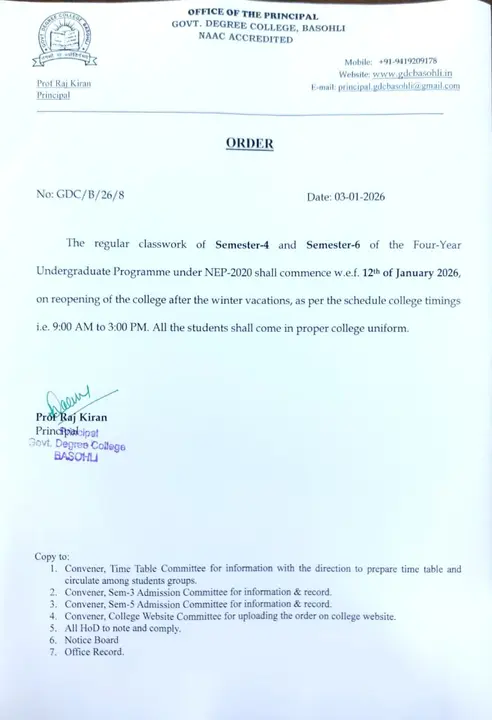 The regular classwork of BA/B.Sc. semester 4th and 6th shall commence w.e.f. 12/01/2026