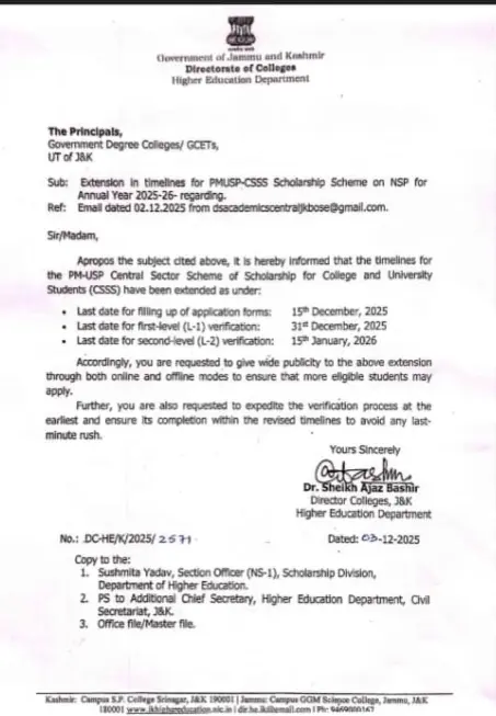 Extension of timelline for PMUSP-CSSS scholarship scheme on NSP for the year 2025-26
